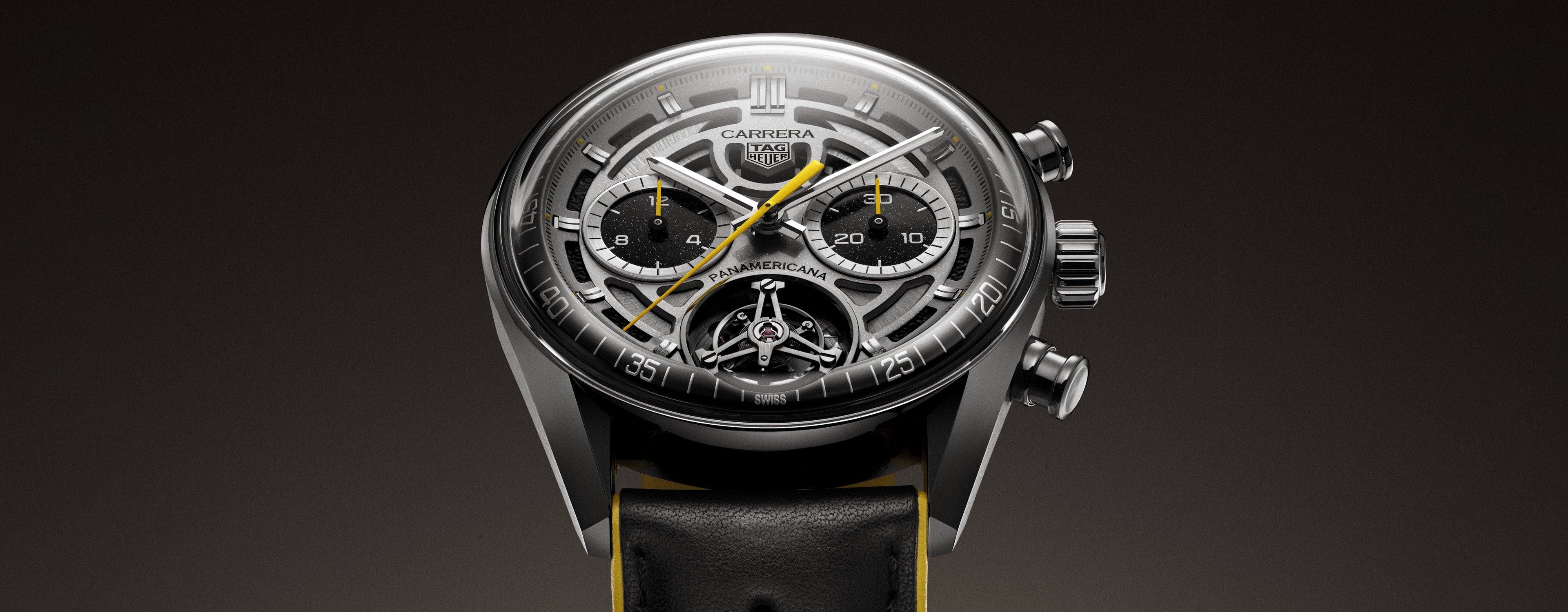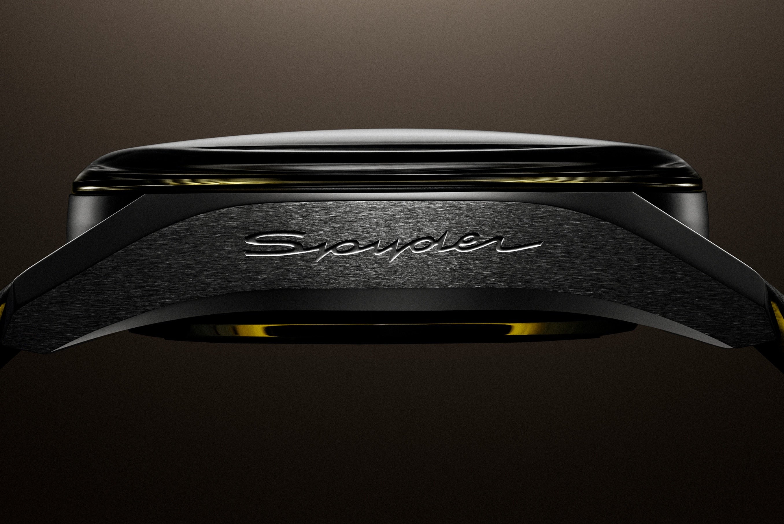 O mostrador esqueletizado prateado, inspirado nos aros do Porsche 550 Spyder, apresenta sutis detalhes amarelos, remetendo ao carro icônico e transmitindo ao relógio uma sensação de velocidade.