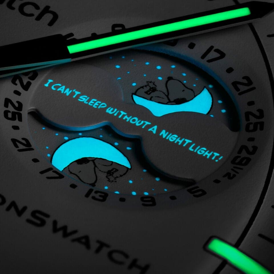 Fazendo referência à lua cheia com seu esquema de cores totalmente branco, este modelo é o primeiro cronógrafo na história da Swatch a apresentar uma função de fase da lua, indiscutivelmente a mais poética de todas as complicações de um relógio. Em um toque divertido, o Snoopy, que está associado às missões espaciais tripuladas desde a década de 1960, adorna o submostrador de fase da lua posicionado às 2 horas.