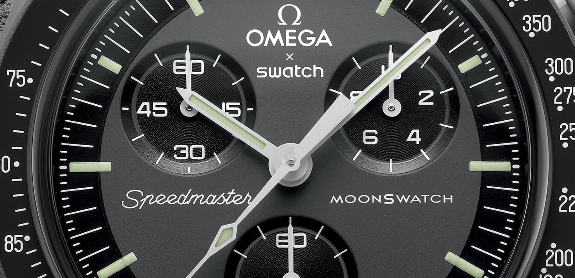 Com sua intensa cor cinza profunda e pulseira de VELCRO® cinza metálico, este relógio de edição limitada demonstra seriedade. O ponteiro dos segundos do cronógrafo, os ponteiros dos submostradores e a escala taquimétrica são brancos. Os submostradores e o bisel são pretos. Todos os mostradores da coleção exibem a marca OMEGA X Swatch, o icônico logotipo Speedmaster e o logotipo MoonSwatch. A construção em vidro de origem biológica, o "S" gravado integrado ao centro do vidro, o padrão circular fino e sofisticado no anel externo do mostrador e nos submostradores embutidos, a construção angular e suave das asas, o icônico detalhe do "ponto sobre 90" na escala taquimétrica e, claro, a sensação única da Biocerâmica são comuns a todos os modelos. Os ponteiros de horas, minutos e segundos do cronógrafo, bem como os marcadores de horas, possuem Super-LumiNova® para um brilho perfeito no escuro.