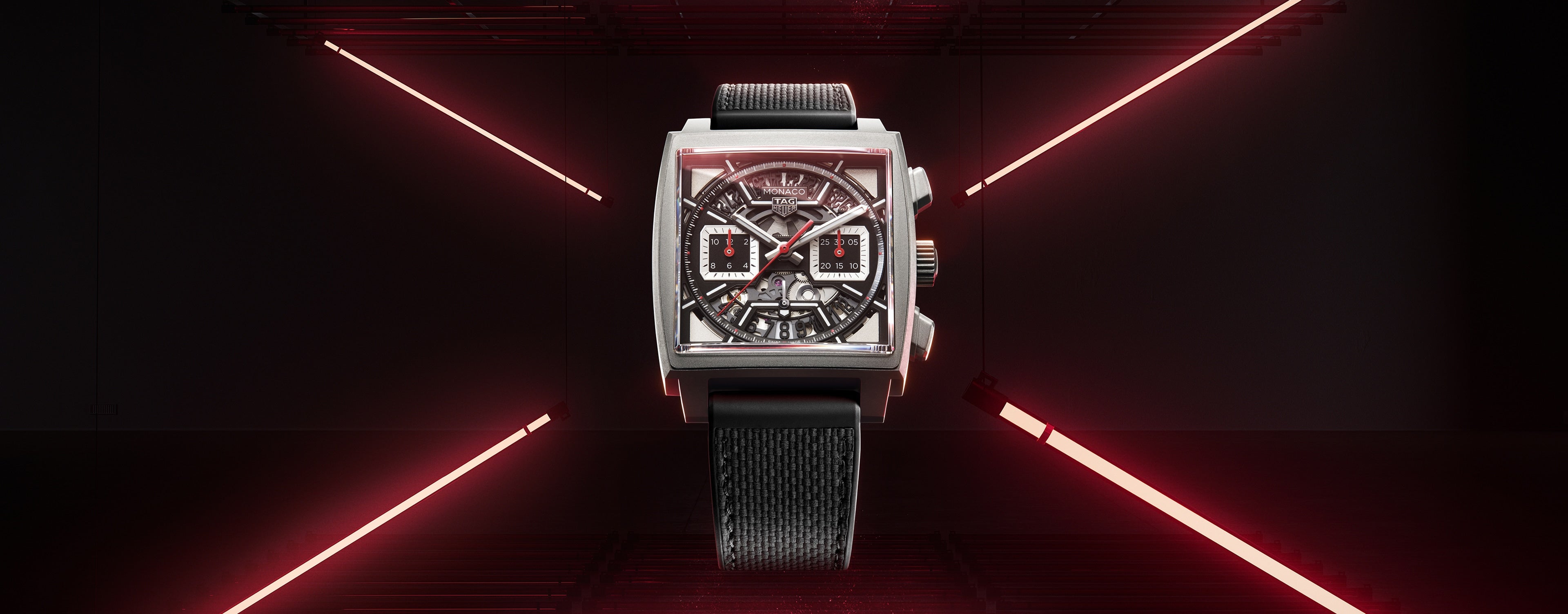 Contrastando com o mostrador esqueletizado preto jateado, os detalhes vermelhos e brancos vívidos adicionam um toque ousado a este relógio inspirado nas corridas.