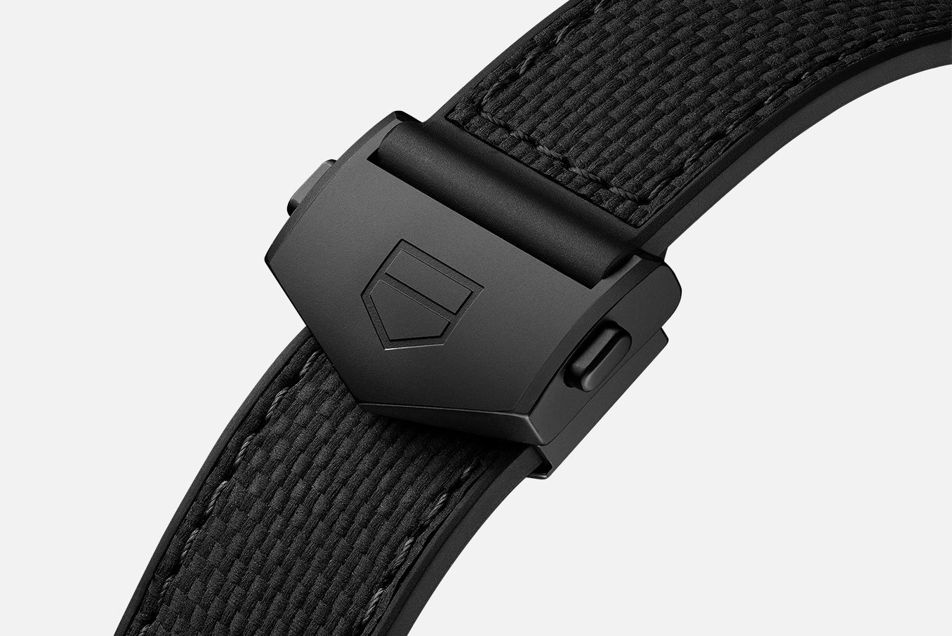 A caixa de 39 mm em titânio revestido com DLC preto, leve e resistente, vem com uma pulseira de couro preto e borracha em relevo — o ápice da elegância esportiva.