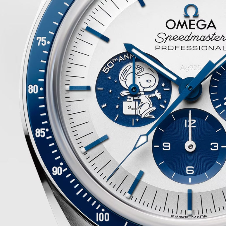 O mostrador prateado apresenta Ag925 gravado a laser e nosso cãozinho favorito em um medalhão prateado gravado em relevo no submostrador azul às 9 horas. O mascote veste seu icônico traje espacial, semelhante em estilo ao famoso broche de prata do Prêmio Snoopy.