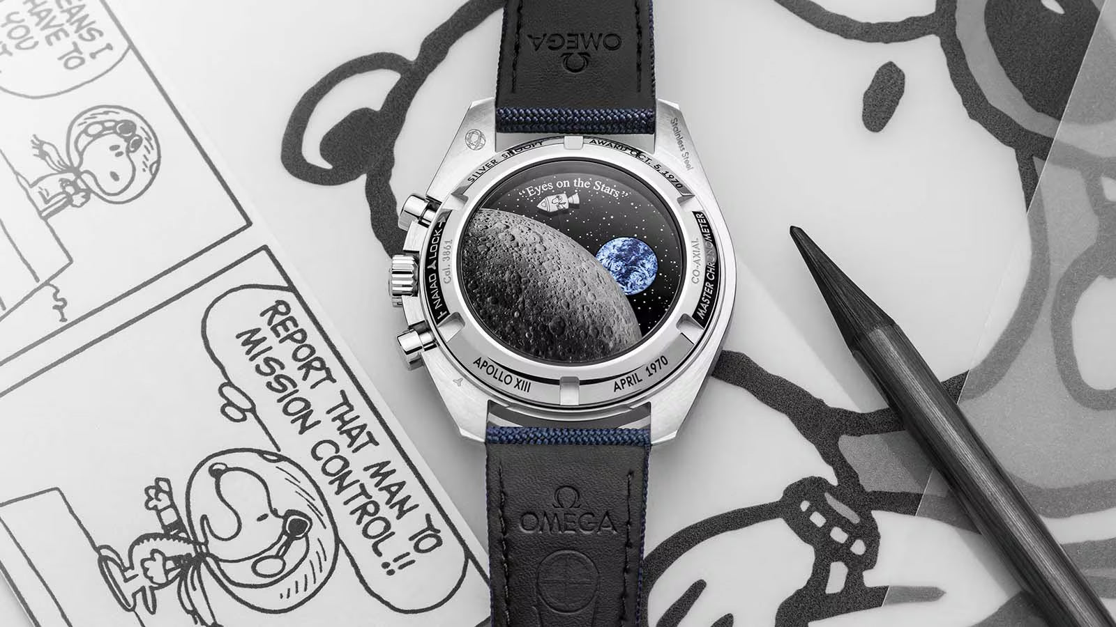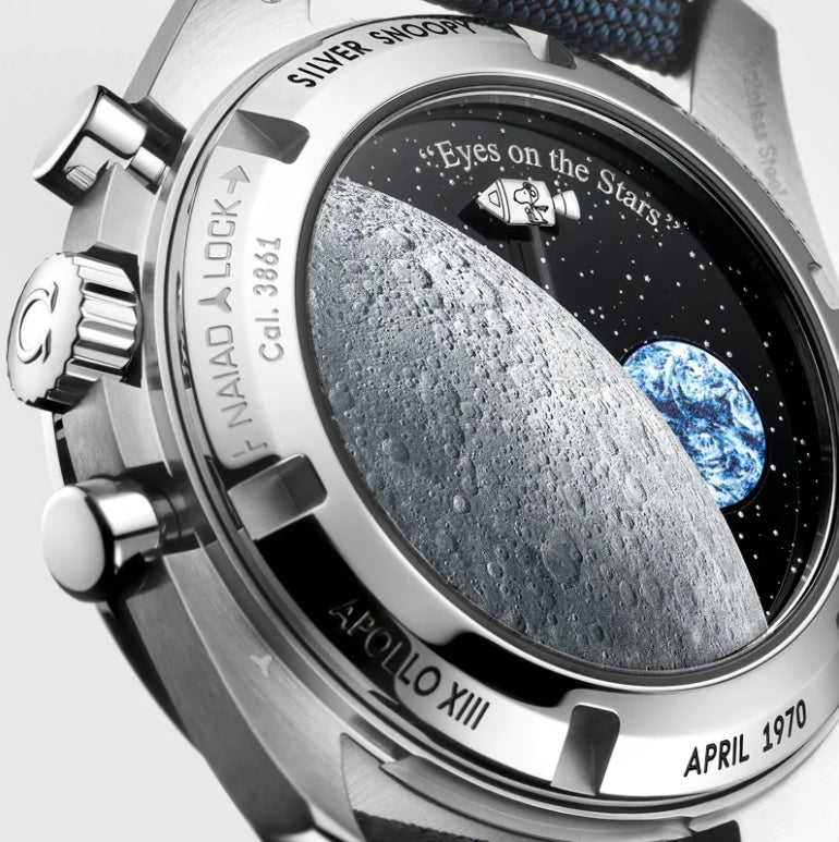 O sistema NAIAD LOCK mantém todas as gravações do fundo da caixa na posição correta, incluindo homenagens à Apollo 13 e o Prêmio Snoopy de Prata. A OMEGA recebeu o prêmio sete meses depois que o Speedmaster ajudou a salvar a tripulação da Apollo 13.