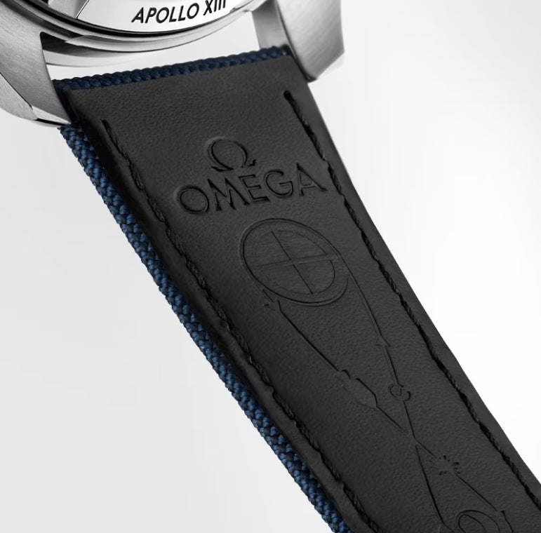 A bracelete azul em tecido de nylon combina com outros elementos azuis do relógio e até inclui a trajetória da missão Apollo 13 gravada em relevo no forro. A célebre volta no lado distante da Lua também foi incluida.