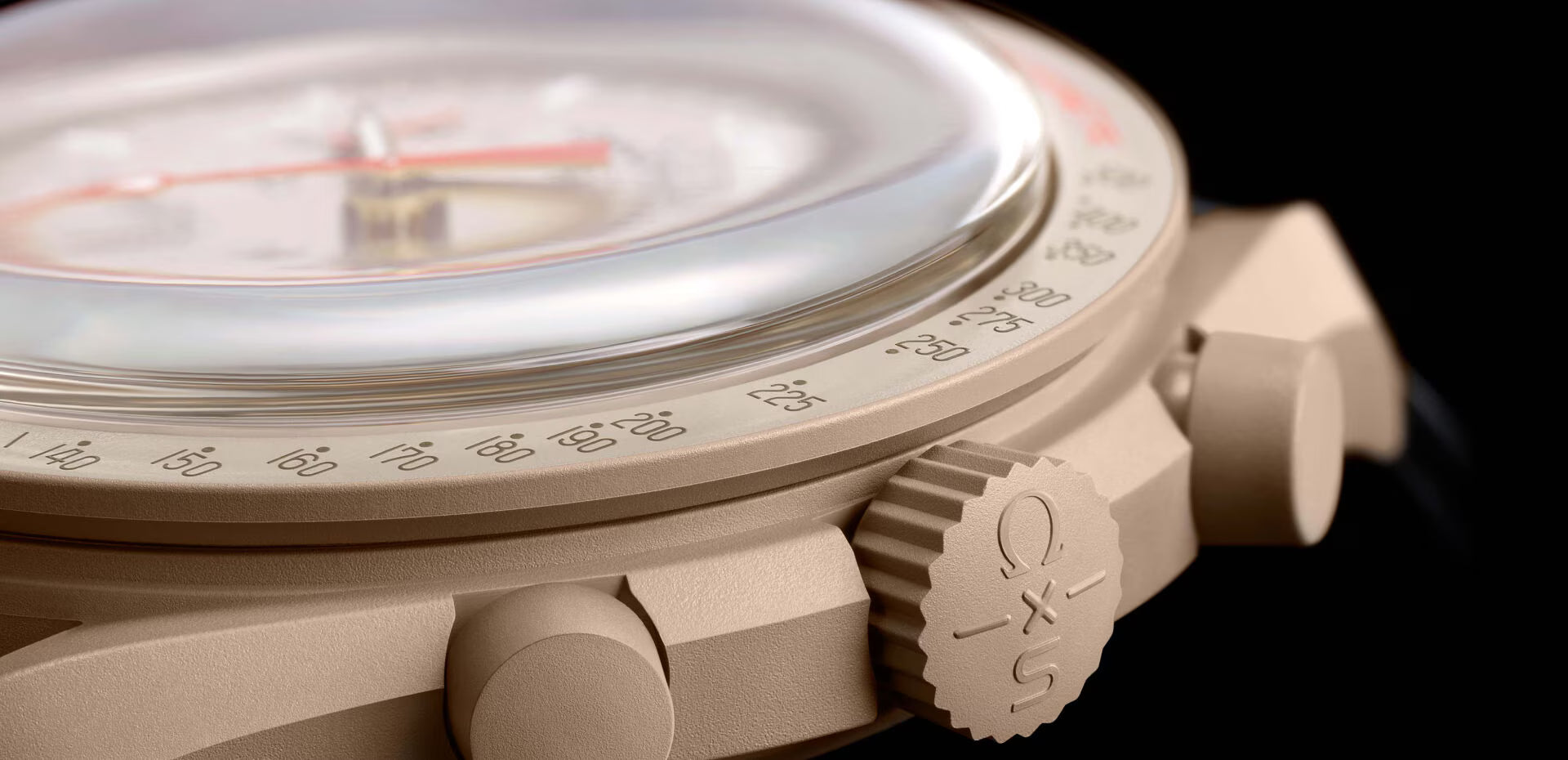 Os tons bege deste relógio, que não é de edição limitada, contrastam perfeitamente com a pulseira preta de VELCRO®. O ponteiro dos segundos do cronógrafo e os ponteiros dos submostradores às 10 e 2 horas são laranja, em homenagem ao OMEGA Speedmaster Ultraman. O ponteiro do submostrador às 6 horas é marrom. Uma escala taquimétrica bege-escura com detalhes em laranja adorna o bisel bege-claro. Todos os mostradores da coleção exibem a marca OMEGA X Swatch, o icônico Speedmaster e o logotipo MoonSwatch. A construção em vidro de origem biológica, o "S" gravado integrado ao centro do vidro, o padrão circular fino e sofisticado no anel externo do mostrador e os submostradores embutidos, a construção angular e suave das asas, o icônico detalhe do "ponto sobre 90" na escala taquimétrica e, claro, a sensação única da Bioceramic são comuns a todos os modelos. Os ponteiros de horas, minutos e segundos do cronógrafo, assim como os marcadores de hora, possuem Super-LumiNova® para um brilho perfeito no escuro.
