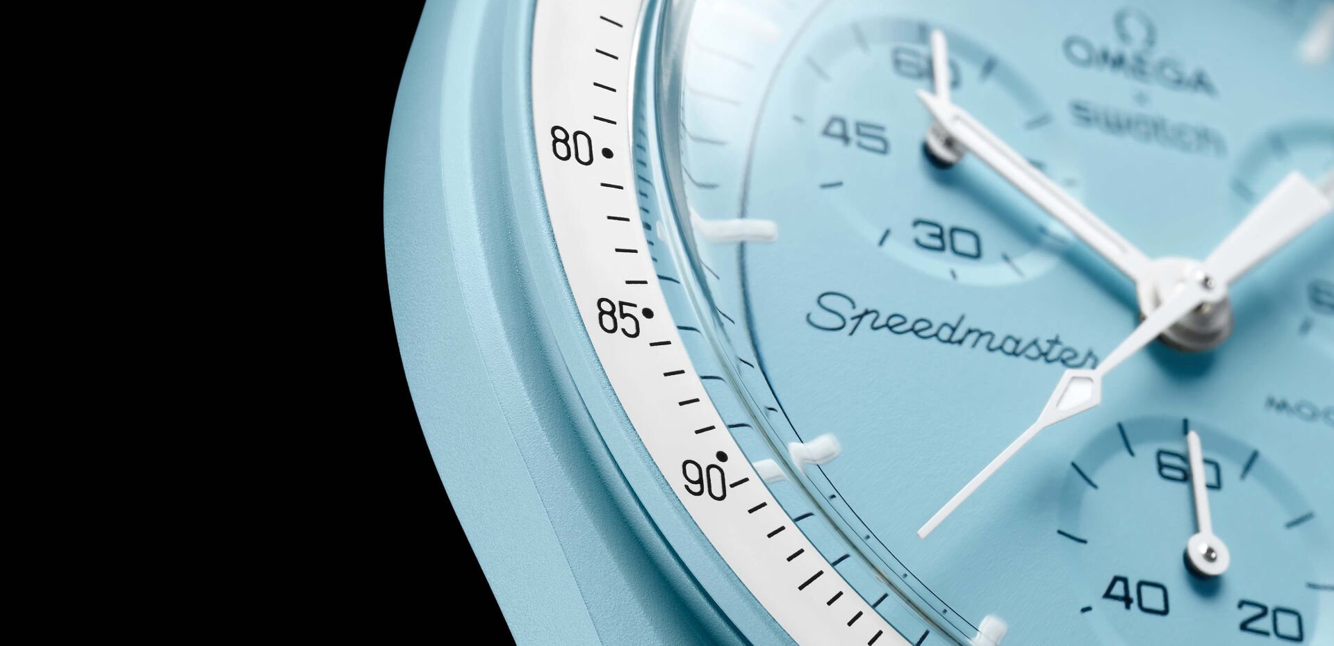 Neste modelo não limitado, o azul pastel encontra uma pulseira de VELCRO® branca brilhante. Todos os ponteiros são brancos. Uma escala taquimétrica preta adorna o bisel branco. Todos os mostradores da coleção exibem a marca OMEGA X Swatch, o icônico logotipo Speedmaster e o logotipo MoonSwatch. A construção em vidro de origem biológica, o "S" gravado integrado ao centro do vidro, o padrão circular fino e sofisticado no anel externo do mostrador e os submostradores embutidos, a construção angular e suave das asas, o icônico detalhe do "ponto sobre 90" na escala taquimétrica e, claro, a sensação única da Biocerâmica são comuns a todos os modelos. Os ponteiros de horas, minutos e segundos do cronógrafo, bem como os marcadores de horas, possuem Super-LumiNova® para um brilho perfeito no escuro.