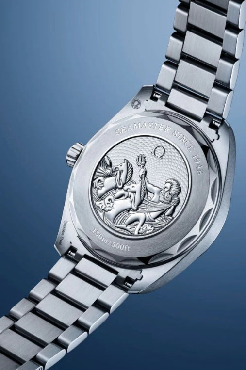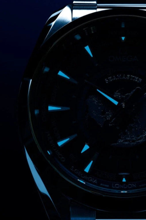 O Aqua Terra Worldtimer de 43 mm em aço inoxidável é equipado com uma pulseira combinando ou pulseira de borracha azul, apresentando o impressionante fundo de caixa comemorativo da OMEGA.