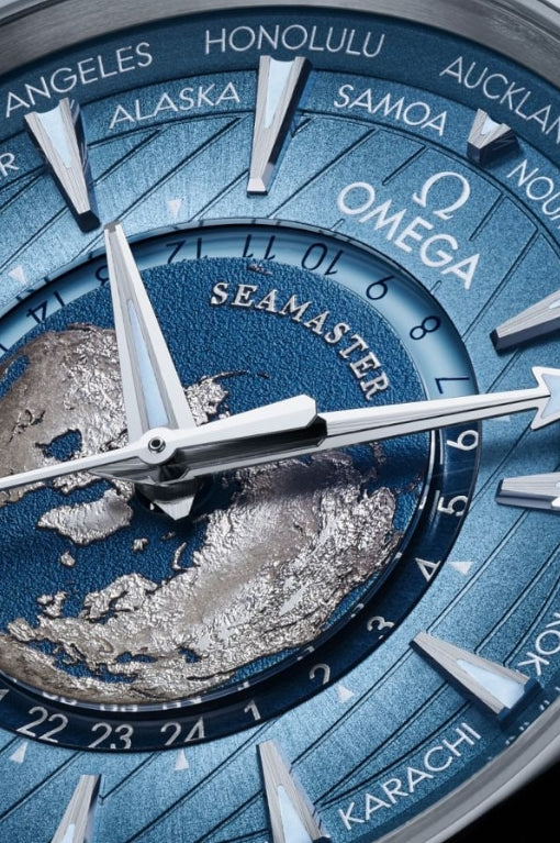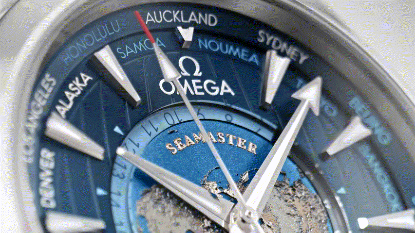 Em sintonia com a tecnologia Aqua Terra, o Worldtimer está equipado para marcar o tempo em um ambiente aquático, 150 metros abaixo das ondas. A força motriz é o OMEGA Co-Axial Master Chronometer 8938.
