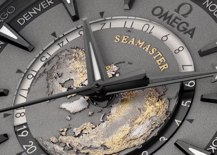 A parte externa do mostrador prateado opalino exibe listras verticais no estilo “teak” (teca) e um círculo com destinos ao redor do mundo impressos em vermelho (GMT), azul (+1h no verão) e ouro Sedna™ (locais sem horário de verão).Internamente, o Worldtimer é equipado com o calibre Master Chronometer 8939.