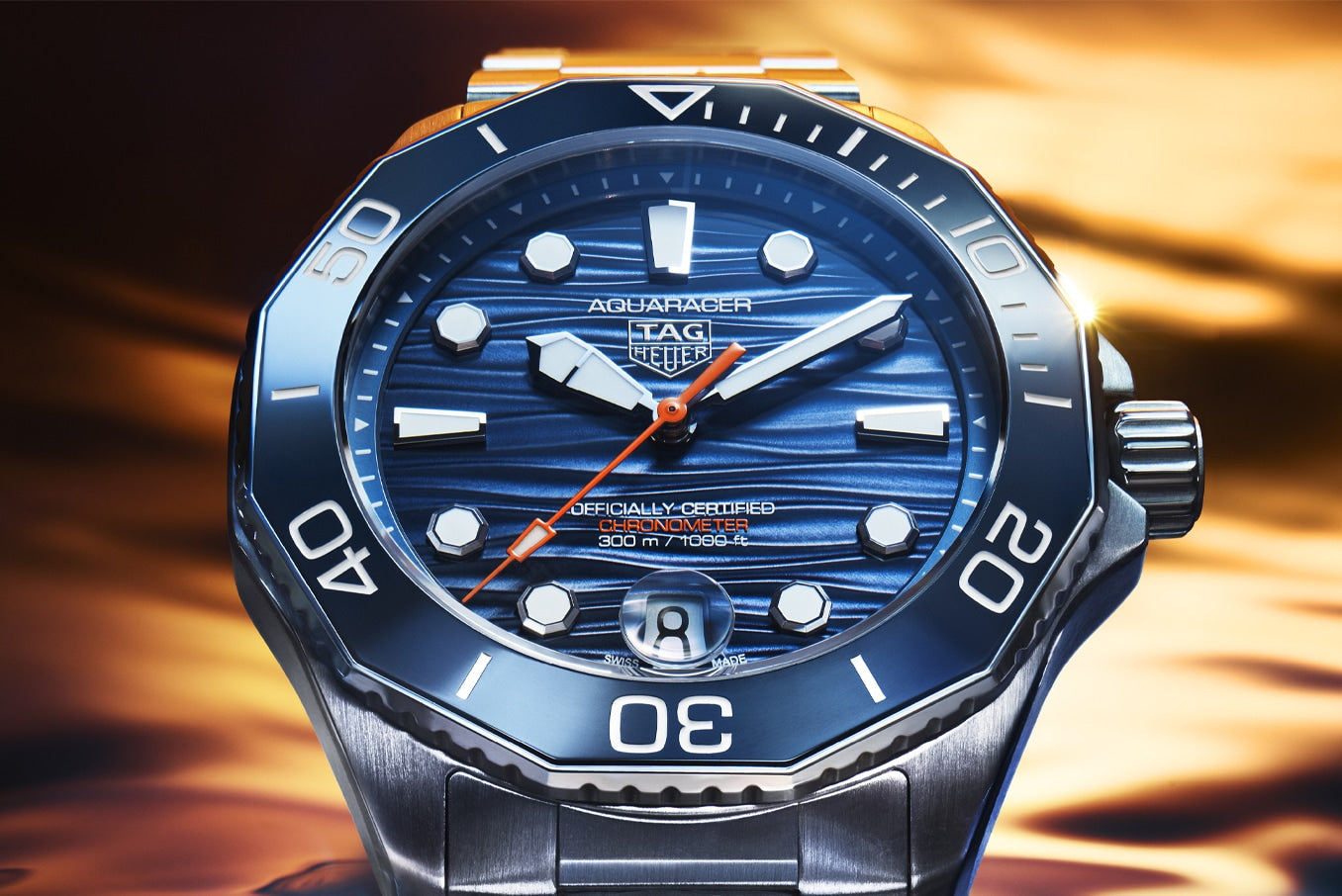 Remetendo à beleza subaquática, o mostrador azul escovado com padrão ondulado apresenta ponteiros e índices aplicados com Super-LumiNova® brancos brilhantes, realçados por um ponteiro central laranja vívido para uma visibilidade ideal.