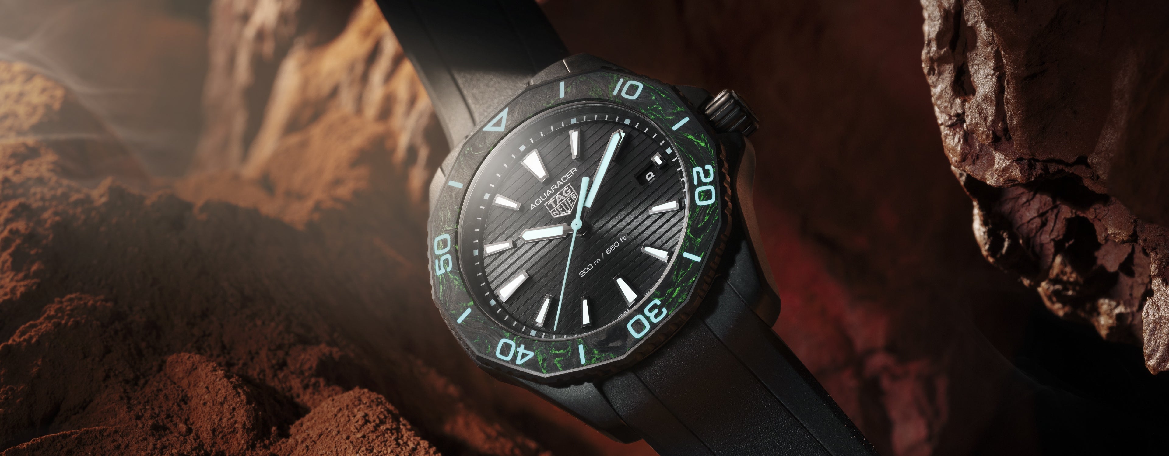 Uma característica de destaque deste TAG Heuer Aquaracer são suas inserções no bezel, feitas de carbono fundido com material luminoso para máxima legibilidade, dia e noite.
