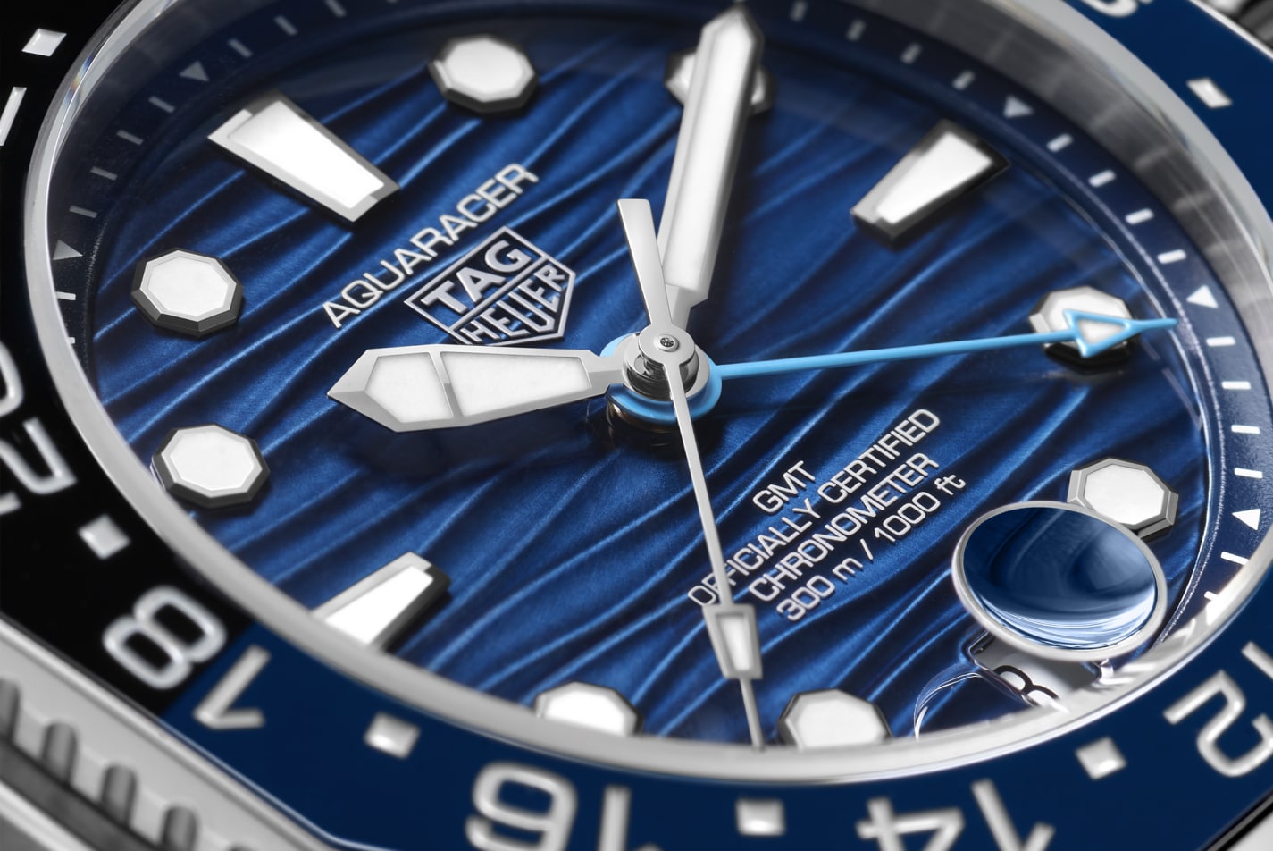 Em tons de azul, em uma referência sutil aos mistérios do oceano, o mostrador possui ponteiros e índices brancos luminosos preenchidos com Super-LumiNova® e um ponteiro GMT azul-claro.
