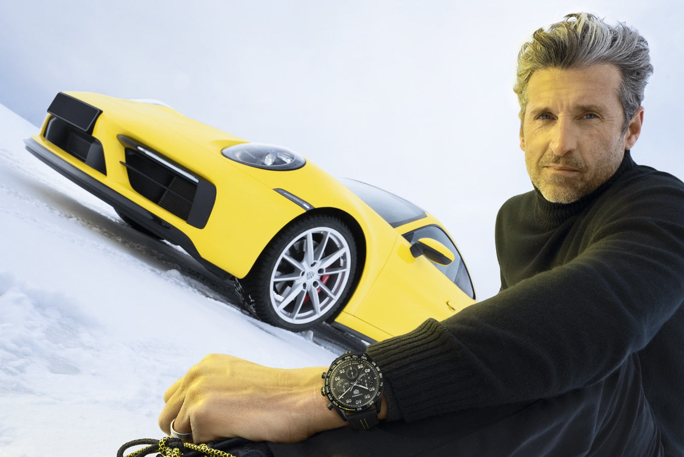 Em homenagem ao interior do Porsche, uma pulseira em couro texturizado com uma arrojada costura amarela. Um fecho dobrável em aço DLC preto combina com a caixa.