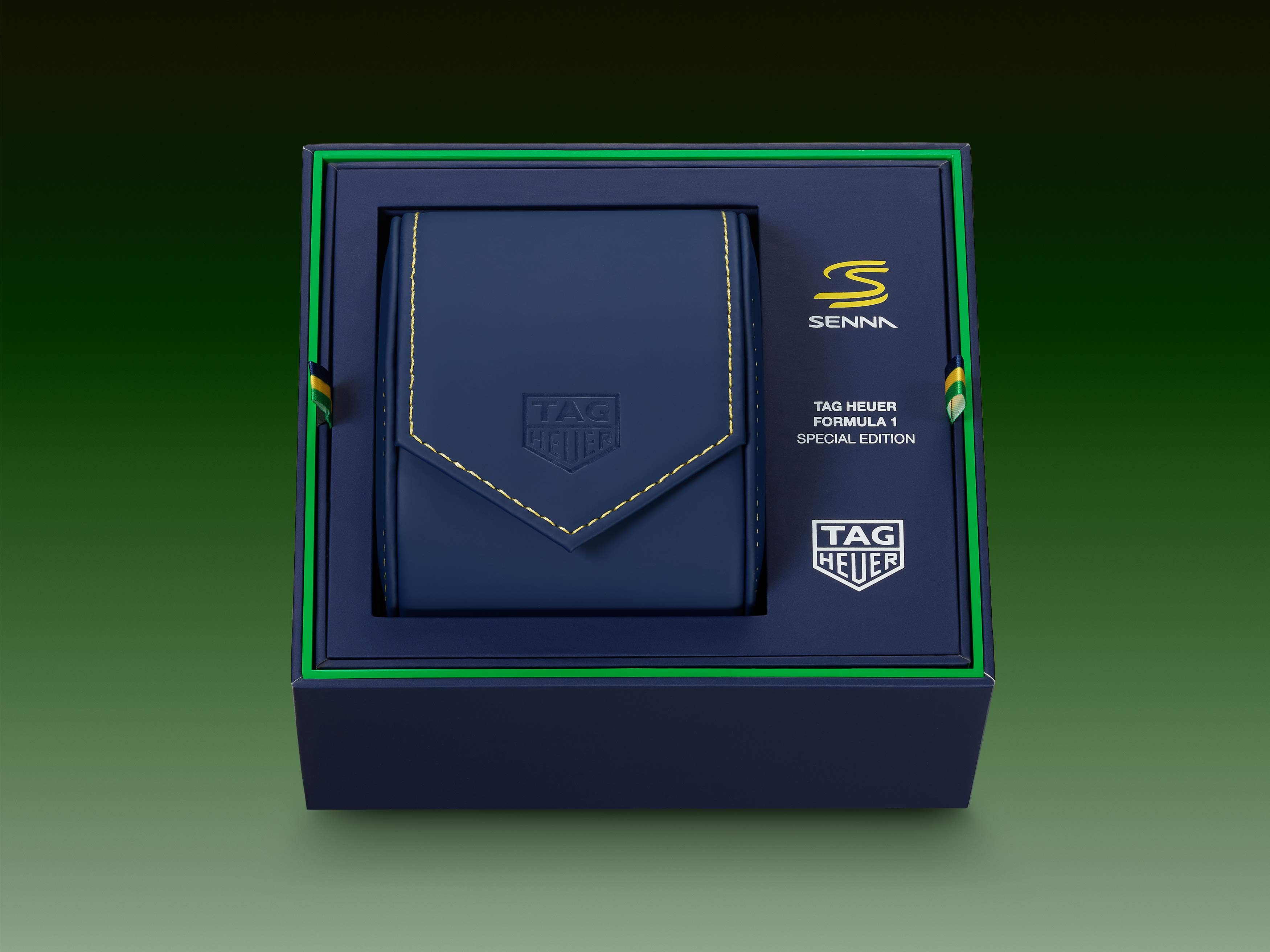 A caixa desta edição especial combina azul-escuro e detalhes em verde e amarelo, em referência à pintura do capacete de Ayrton Senna. Um estojo de viagem, com o logo da TAG Heuer gravado e costura amarela, completa a homenagem à lenda da velocidade e da resistência.